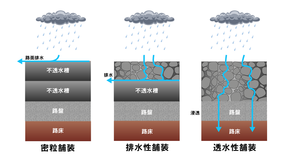 従来のアスファルトでは粒子が密になっており、水が浸透することなく表面を流れて排水する仕組みでした。